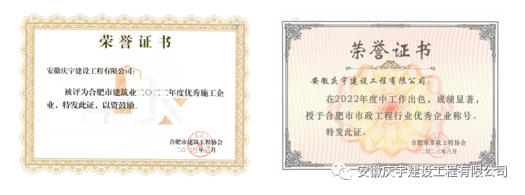 另外合肥市建筑工程协会和合肥市市政工程协会分别发布的:合建协【2023】14号、合市政协【2023】16号文件中,我庆宇公司的分别荣获“2022年度优秀施工企业”和“2022年度合肥市市政工程行业优秀企业”。